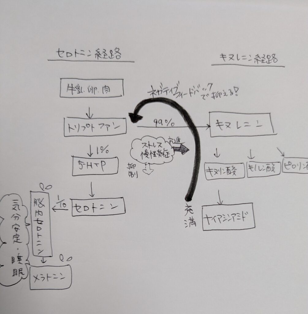 サプリなどでナイアシンを充分量摂取すれば、これ以上沢山要らないという、ネガティブフィードバックが働き、キヌレニン経路の動きが抑制されます。